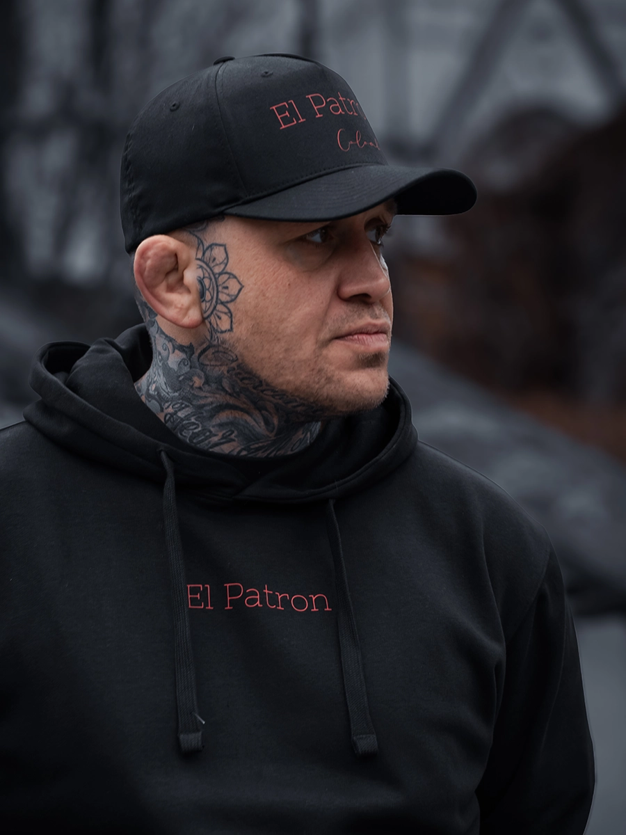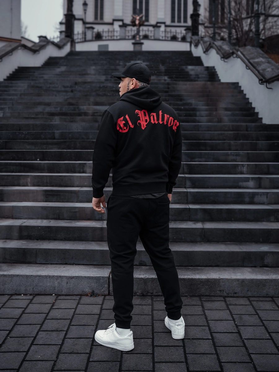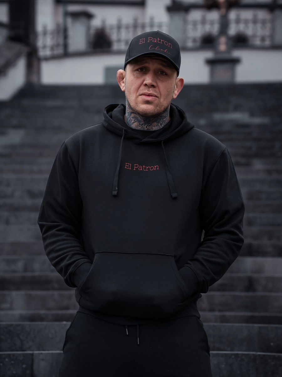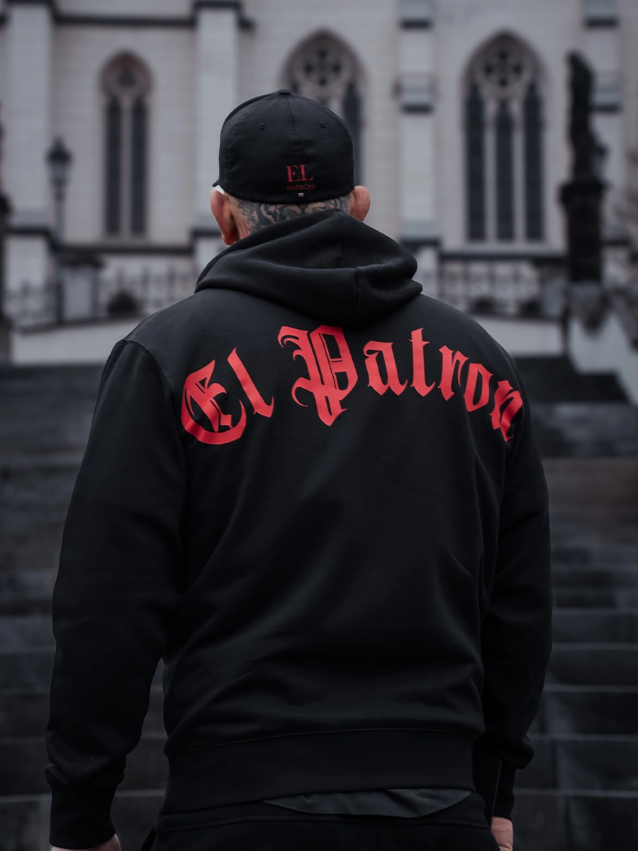 Pánska mikina EL PATRON ELEGANT v čiernej farbe predstavuje výrazný kúsok s inšpiráciou kolumbijskou identitou a charakterom značky. Dominantný červený dizajnový prvok s ikonickým nápisom EL PATRON vytvára sebavedomý a moderný vzhľad nielen z prednej ale aj zadnej časti